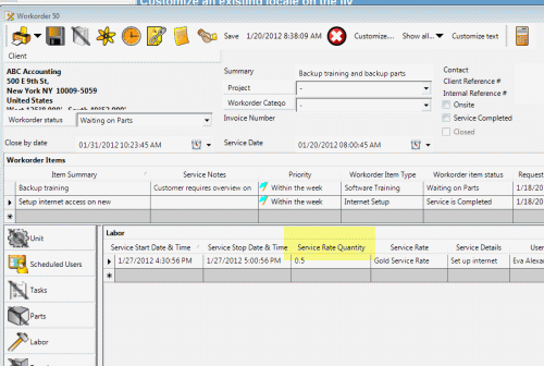In this tutorial we want to edit what is default labeled Service Rate Quantity, so we will open a service workorder entry screen and select the menu option Customize text