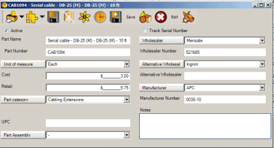 Entering the UPC code here will allow ease of use elsewhere in AyaNova. For example, if users are entering Parts in a Service Work order, they can select the UPC field and scan in the part using a bar code scanner which will automatically select the appropriate part. This adds up to saved time and less mistakes in entry.