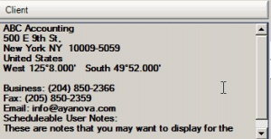 Contact information about the Client, including schedulable user notes are displayed immediately below of the Client button.