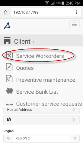 3. View the list of existing service workorders by selecting this client's menu option Service Workorders