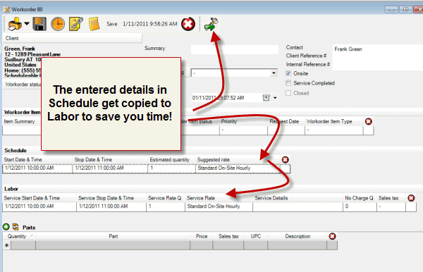 As we won't cover all the fields and selections in the various areas of the service workorder in this tutorial, it is recommended that you do review the Service Workorder section of this Help file for information on suggested use for the fields Workorder Status, Summary, Service Notes, Priority, etc