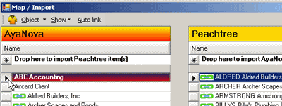 Or if you need to import objects at any time, select the menu Tools, than Map and import to open the Map/Import screen which defaults to showing the AyaNova clients on the left and PeachTree customers on the right.