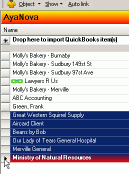 4.You can also import multiple AyaNova items at one time by select the first AyaNova client or vendor and than holding the SHIFT key when you select the last AyaNova client or vendor <note how all from the first selected to the last are highlighted>. And than drag and drop as above.