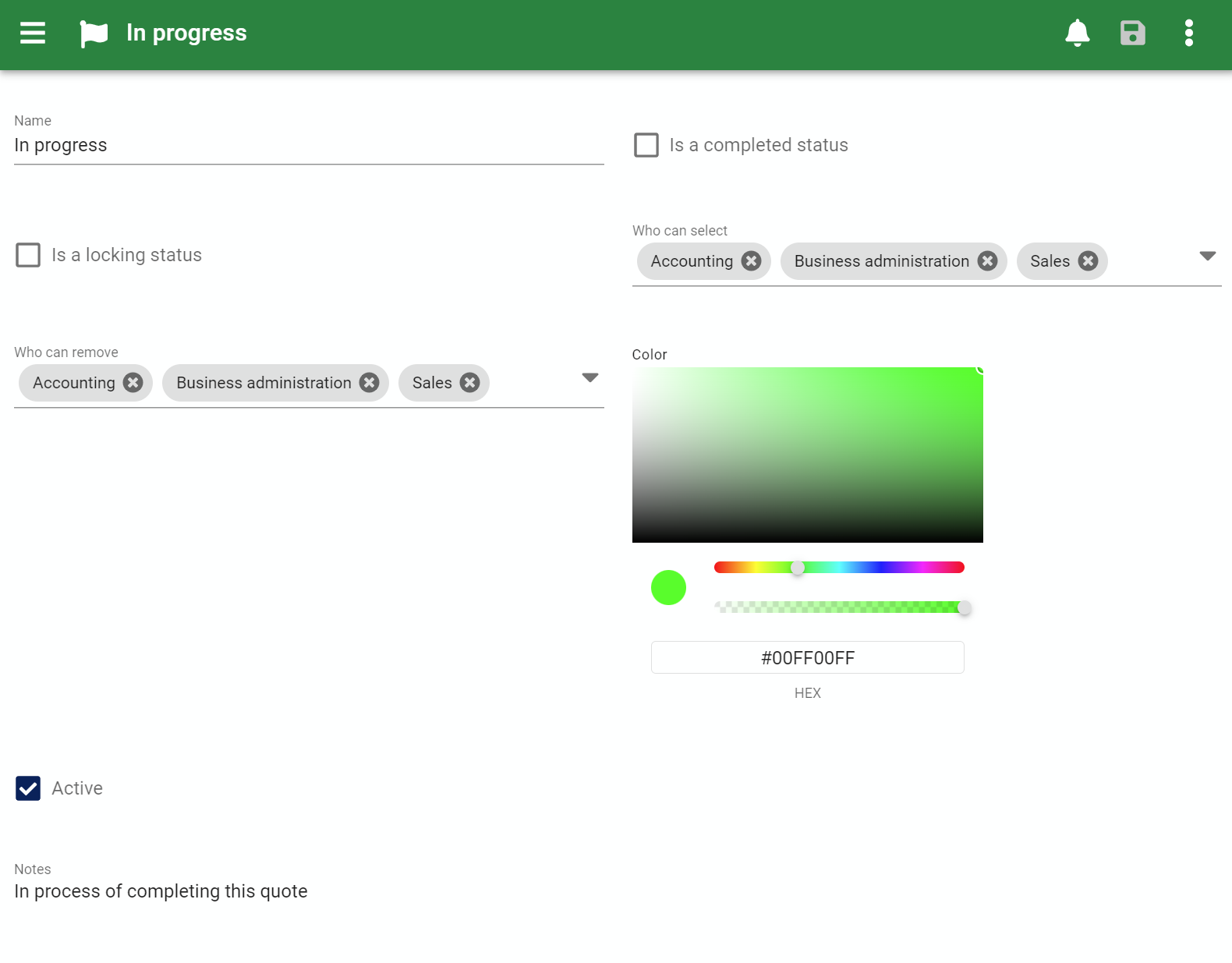A color can be selected to visually represent the status so users can see at a glance what state the quote is in on the Quote data table. This color can also be used in report templates if appropriate.