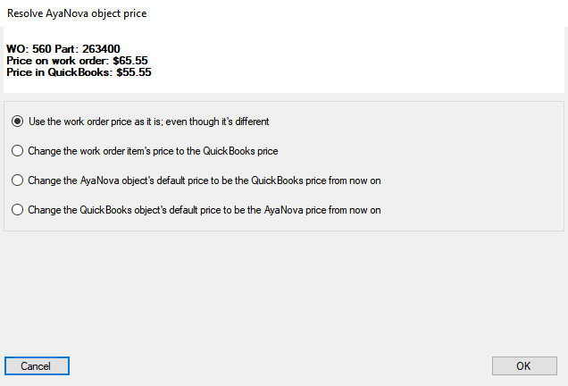 If the issue is a Part price that is different in AyaNova than it is in the linked QuickBooks Item you can use the "Resolve AyaNova object price" dialog box to fix this particular issue: